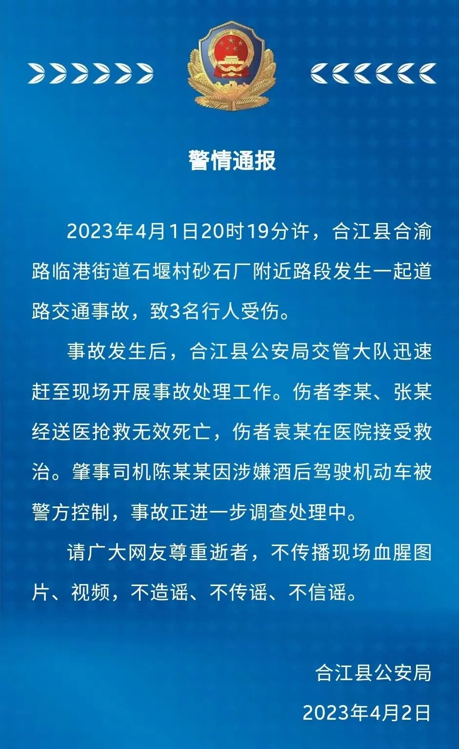 天天快资讯丨四川合江发生一起交通事故致2死1伤 警方:司机涉嫌酒驾